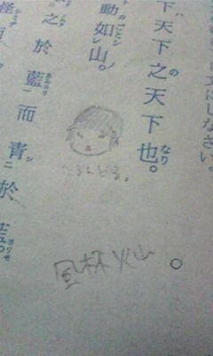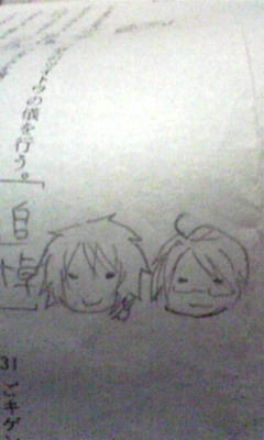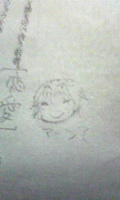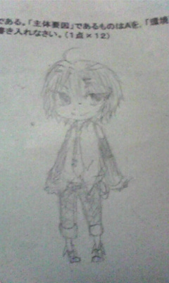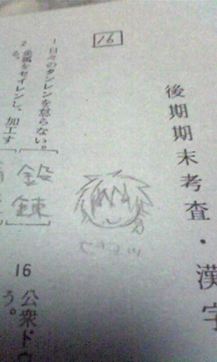 いやー。 毎回の如く、テスト終わってます。 そして、毎回の如く、問題用紙に落書きしてる私です。 明日は国語なんでプリントやってたんですが、人生初のテスト勉強をしよーとしたので、睡魔が襲ってきました。 明日は雨らしいですね。 では。 |