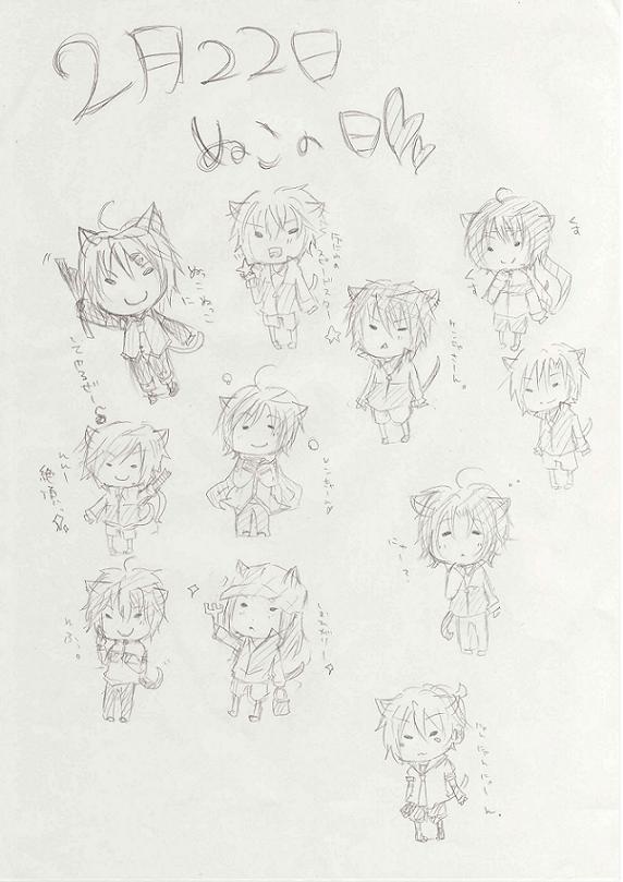 最近ここの更新が携帯の率が高くてすみません・・・。 今日は2月22日猫の日ですね! たくさんネコミミの落書きしましたよ。 明日載せれたら載せたいです。 では、明日のテストも死んできます。 |